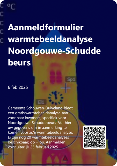Vanuit gemeente Schouwen-Duiveland zijn er nog een aantal warmtebeeldanalyses beschikbaar. U kunt zich nog aanmelden tot woensdag 26 februari 2025. Wellicht weet u nog mensen die ook mogelijk interesse hebben in een warmtebeeldanalyse. Buren, kinderen, ouders, familie, vrienden? Stuur gerust onderstaande link en/of QR-code door via de mail of bijvoorbeeld Whatsapp.