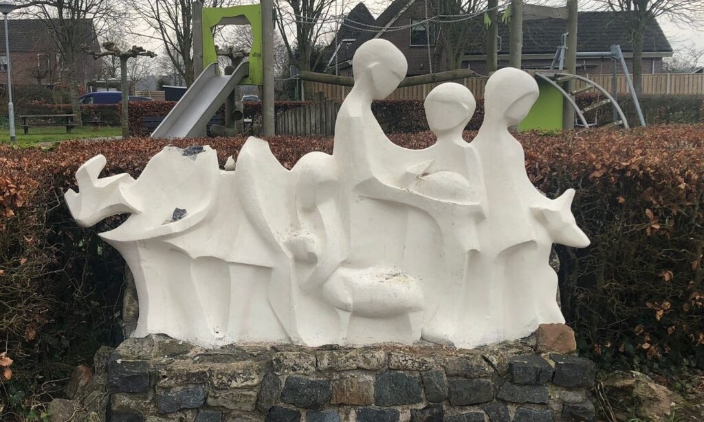 Helaas is het beeld naast de speeltuin weer vernield. Nog maar een aantal weken geleden gerestaureerd en nu weer …….!Is het een ongeluk of opzet? Wie kent de oorzaak?
